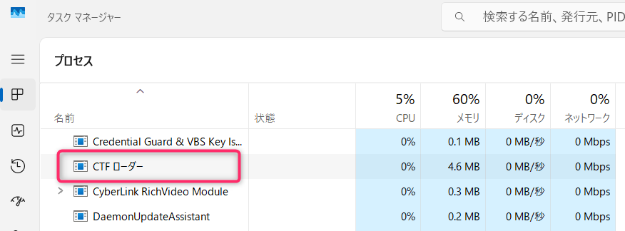 タスクマネージャーで作業をする場合は、「CTFローダー」と表示されているプログラムが目的のものです。これを右クリック ⇒ [タスクの終了]をクリックします。タスクマネージャーを閉じて作業完了です。