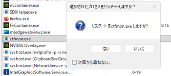 Process Lassoの稼働中のプログラムリストからctfmon.exeを見つけ出し、これを右クリック。表示されるリストから「リスタート」を選択。「リスタートをctfmon.exeしますか?」と聞いてくるので、[はい]をクリック。これでIME関係の不具合は解消します。